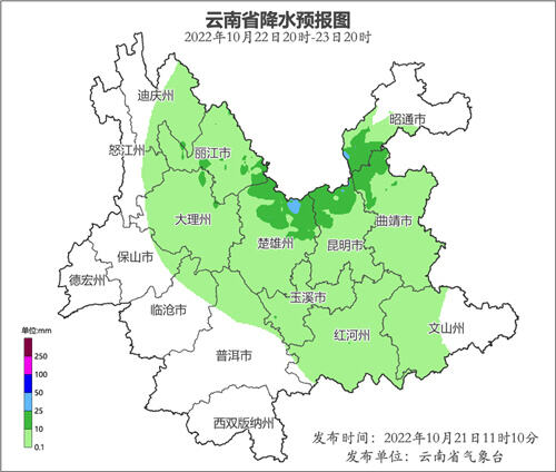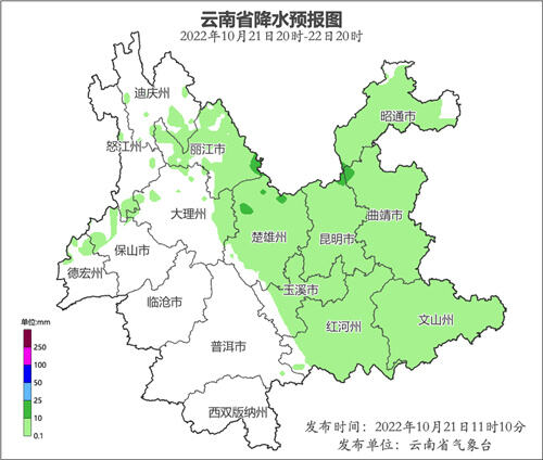 10月21日20时到10月22日20时:昭通、曲靖、文山、昆明、玉溪、红河、楚雄、丽江阴有小雨局部中雨,其它地区多云间阴有分散性阵雨。