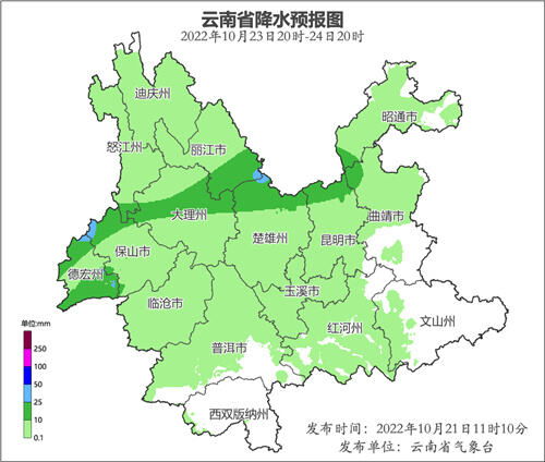 10月22日20时到10月23日20时:昭通南部、曲靖北部、昆明北部、楚雄北部、丽江东南部阴有小到中雨局部大雨,昭通北部、文山东部、迪庆西部、怒江西部、保山、德宏、临沧、普洱、西双版纳多云间阴,其它地区阴天间多云有小雨。