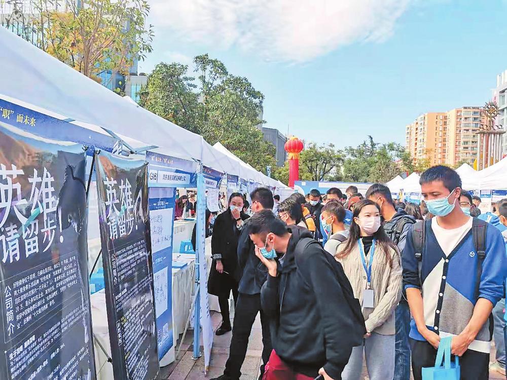 2021年10月26日,在云南省“金秋招聘月暨高校毕业生就业服务系列活动”现场,应届高校毕业生龙涛在招聘会上选择了4个理想岗位并顺利投递简历。这是我省服务重点就业人群,人社、民政等5部门联合线上线下4万余家用人单位,提供软件工程、人事、行政、文员等390多万个优质岗位,为求职者提供服务的一个缩影。