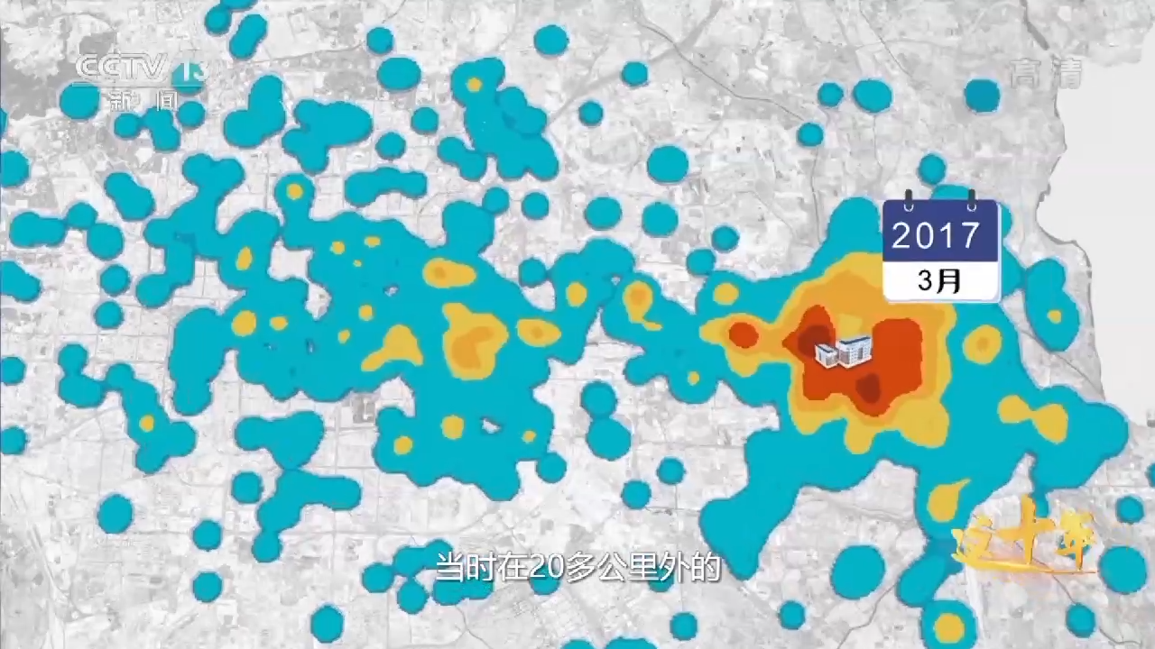 研究人员对数以亿计脱敏后的信令数据进行分析,排除通勤、偶然到访等因素,画出了2017年3月北京通州区中仓社区居民的生活活动分布图。红色表示到访次数多,蓝色表示到访次数少。可以看到当时在20多公里外的中心城区有一片橙红色区域。5年后,这个区域变成了蓝色,而在社区周边,居民的基本生活半径从6.3公里缩小到了4.4公里。