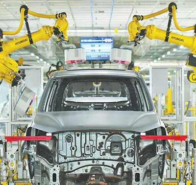 创新发展动能增强。图为河北省沧州市一家汽车工厂,智能机械臂在生产线上作业。