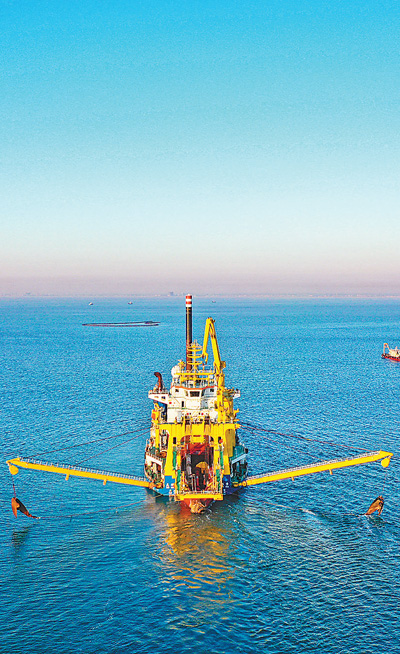 自主创新能力不断增强。图为我国自主设计建造的亚洲最大自航绞吸挖泥船“天鲲号”在江苏连云港港赣榆港区作业。