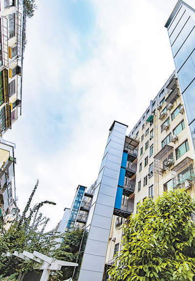 共享发展持续加强。图为江西省赣州市章贡区的老旧小区江湾花园小区,居民楼经过改造后加装了电梯。