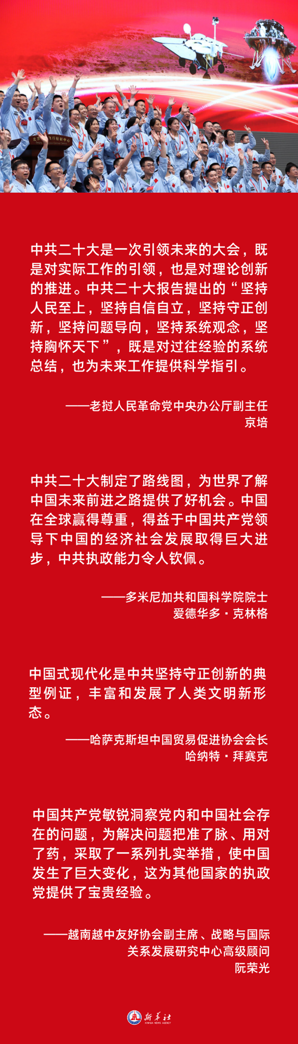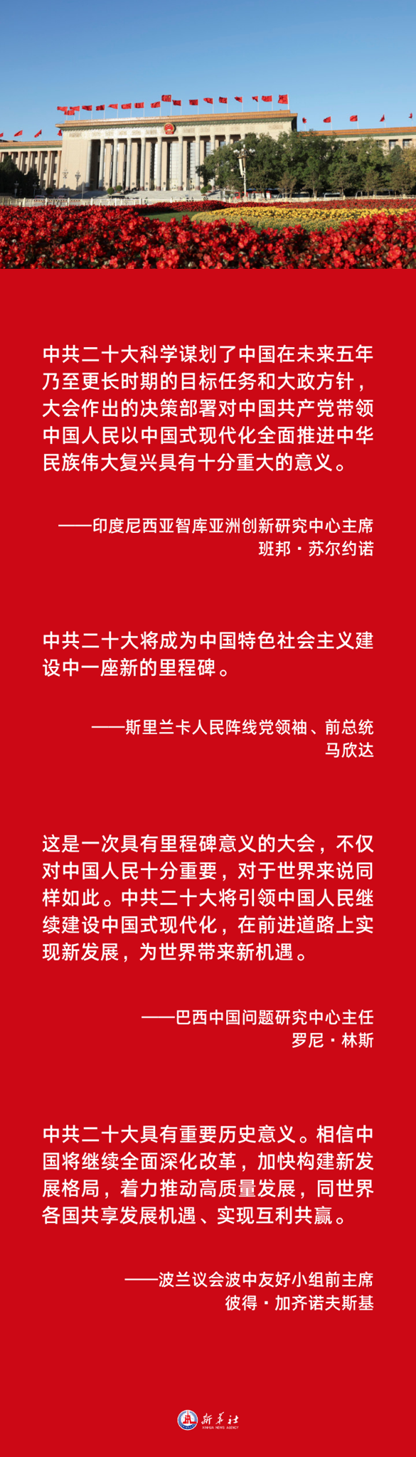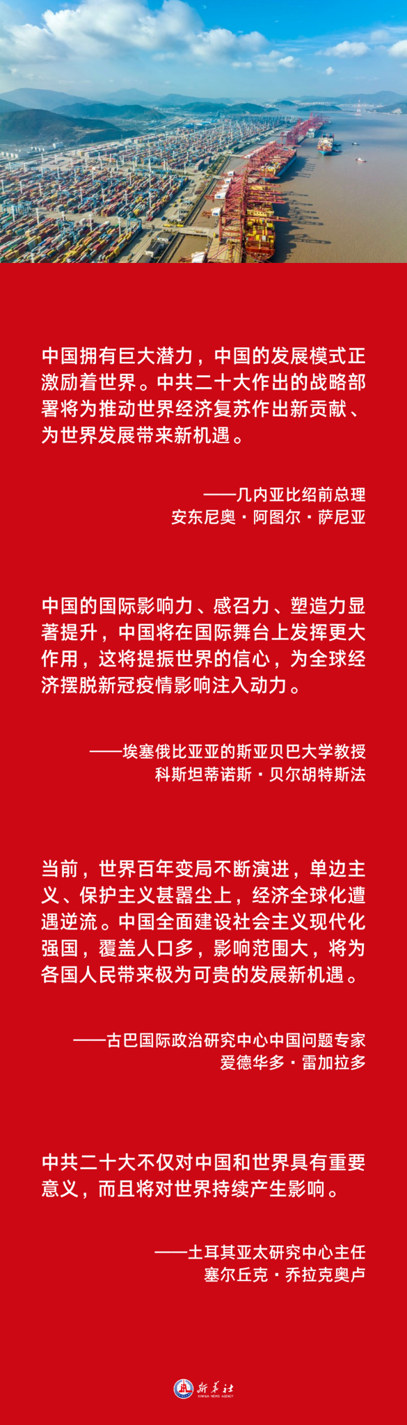 不少海外人士表示,中共二十大为面对巨大挑战的世界提振了信心、注入了动力,让人受到鼓舞、激励。他们期待中国不断以新发展为世界提供新机遇,期待中国共产党在新的历史起点上为世界作出更大贡献。