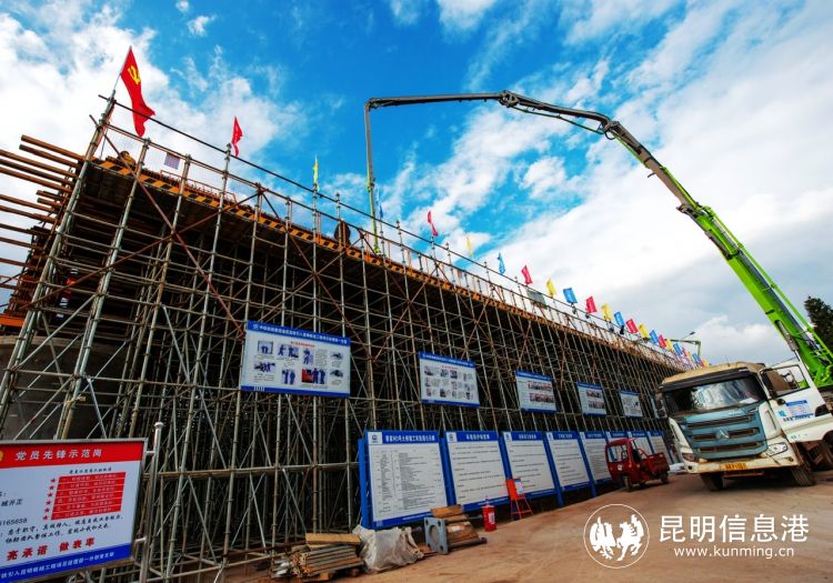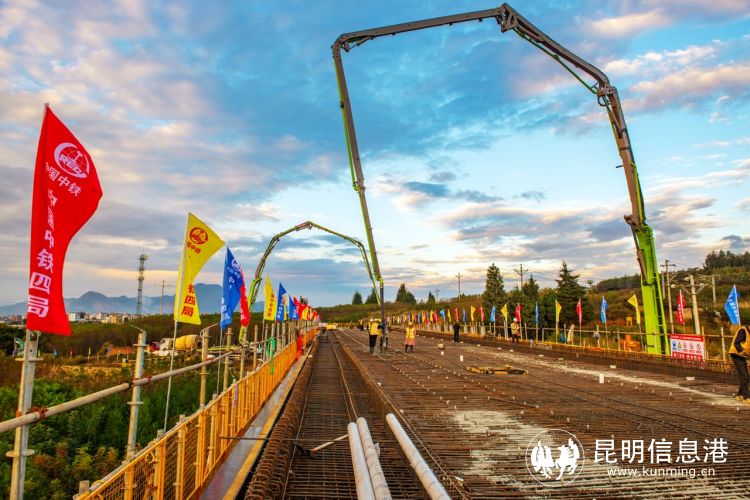 昆明信息港讯 记者上官艳君 10月25日上午,我国“八纵八横”铁路网之一的渝昆高铁建设取得突破,云南境内首座大桥连续梁完成混凝土浇筑施工,标志着渝昆高铁云南段桥梁建设由下部工程向上部工程迈进。