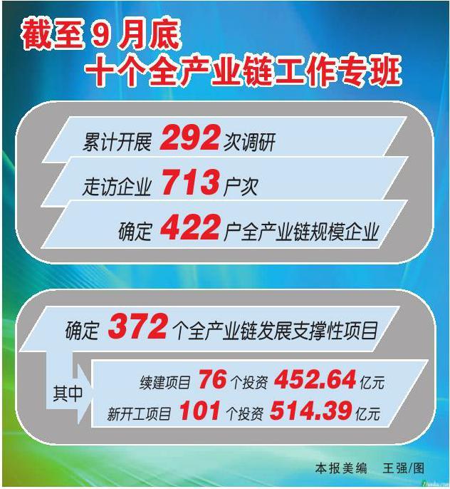 十个全产业链工作专班自成立以来至今年9月底,累计开展292次调研,实地走访企业713户次,深入了解产业发展现状、龙头和重点企业情况,综合分析产业链发展存在的短板和问题、面临的机遇和优势,从全市454户规模以上工业企业中选定422户作为全产业链发展龙头和重点企业。