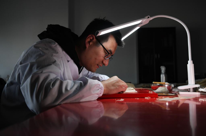 10月20日,在安徽中医药大学图书馆古籍部,古籍修复师茆可人在进行古籍修复。新华社记者 张端 摄