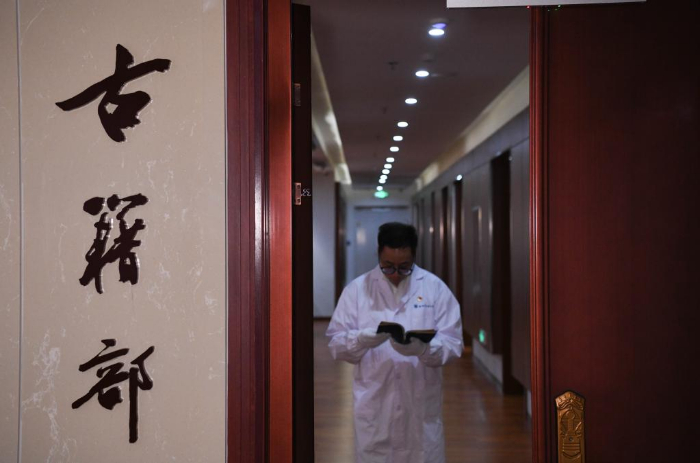 10月20日,在安徽中医药大学图书馆,古籍部主任邓勇取出待修复的古籍。新华社记者 张端 摄