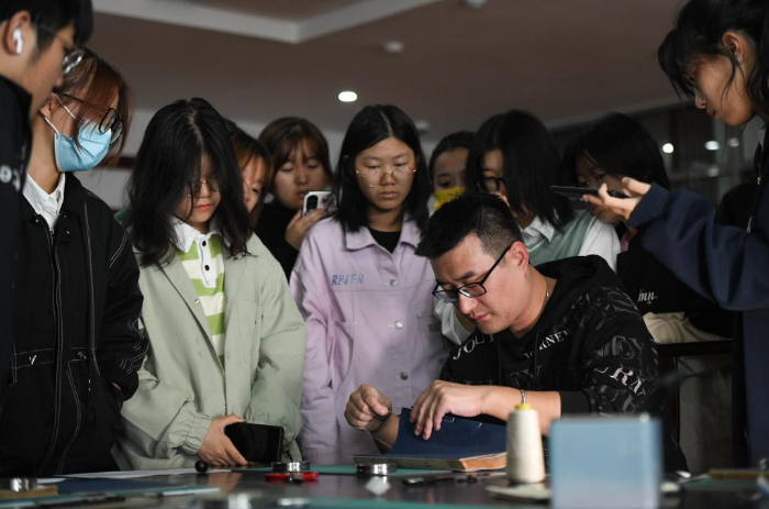 10月20日,在安徽中医药大学图书馆古籍部,古籍修复师茆可人教学生装订古籍。新华社记者 张端 摄