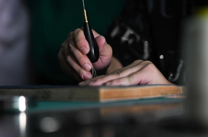 10月20日,在安徽中医药大学图书馆古籍部,古籍修复师茆可人在装订古籍。新华社记者 张端 摄