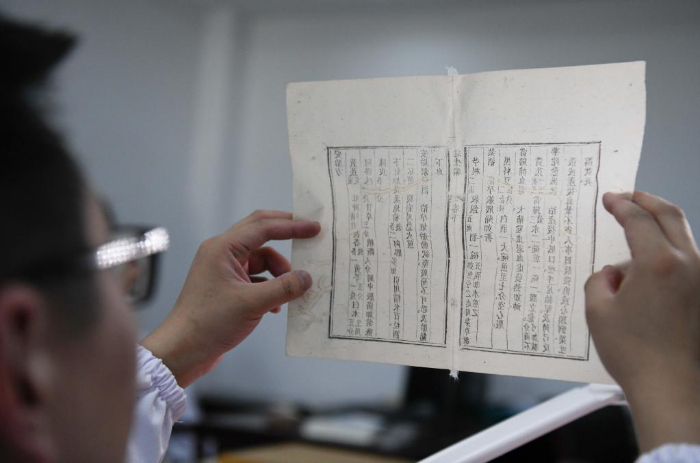 10月20日,在安徽中医药大学图书馆古籍部,古籍修复师茆可人进行古籍修复。新华社记者 张端 摄