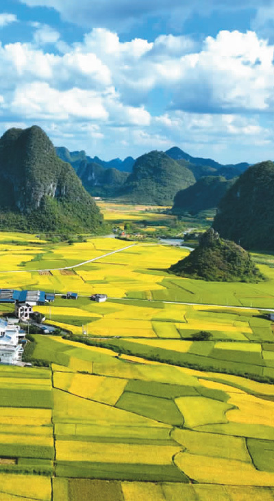 金秋时节,地处祖国西南边陲的广西壮族自治区靖西市单季晚水稻陆续进入成熟收割期,金黄的稻田为大地披上一层金装。图为靖西市化峒镇三友村稻田航拍图。郑 壹 覃蔚峰摄影报道