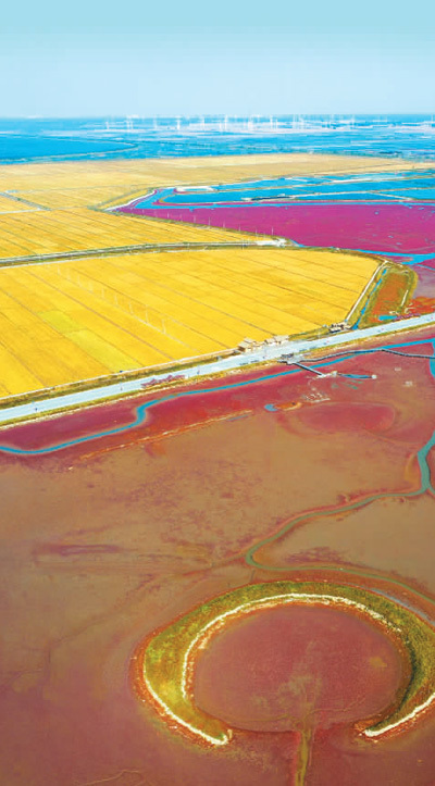 眼下,作为辽宁省水稻主产区的盘锦地区水稻已经进入收割阶段。图为辽宁省盘锦市大洼区金黄色的稻田与长满红色碱蓬草的海滩,红色与黄色相互映衬,色彩斑斓。吕文正摄(人民视觉)