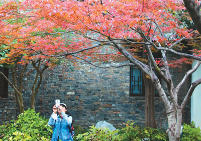 江苏省扬州市何园景区的枫叶渐红,随风摇曳,吸引了游客前来观赏。图为一名游客在何园景区赏枫拍照。孟德龙摄(人民视觉)