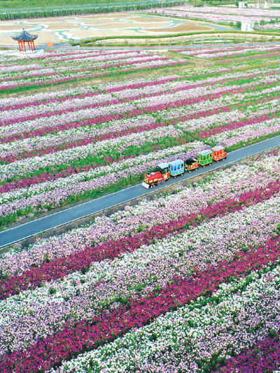 在浙江省东阳市南马镇花园村现代农业生态园里,一辆小火车穿梭在五彩波斯菊湖海中,呈现出一幅美丽乡村生态画卷。包康轩摄(人民视觉)