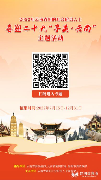 此外,“2022年云南省新的社会阶层人士喜迎二十大“寻美·云南”主题活动”网络专题已同步上线,活动优秀作品集锦、各州市寻美活动开展情况均在专题内进行集纳展示。昆明信息港彩龙社区、新浪微博、知乎、抖音平台投稿入口也已在专题内开放,广大新的社会阶层人士可进入专题,通过以上渠道参与投稿。