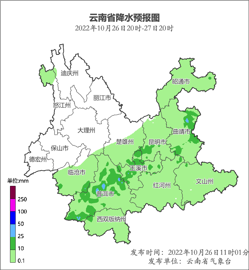 受降雨影响,2022年10月26日20:00~10月27日20:00,怒江州西北部局部区域发生滑坡泥石流的风险高;迪庆州西北部,怒江州西北部、北部,大理州中部局部区域发生滑坡泥石流的风险较高。
