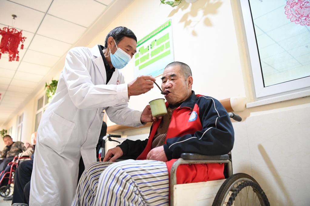 2021年12月28日,河北省景县人民医院医养中心工作人员帮助老人喝水。新华社记者 朱旭东 摄