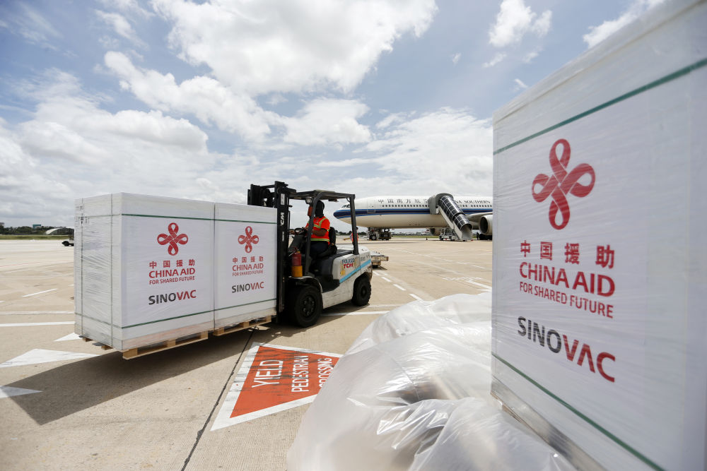 工作人员在柬埔寨金边国际机场运输中国政府援助柬埔寨的科兴新冠疫苗(2021年10月14日摄)。新华社发(批隆 摄)