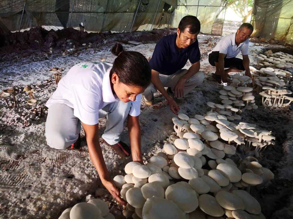 在斐济楠迪,中国专家和当地雇员检查菌菇生长情况(2018年6月12日摄)。新华社记者 张永兴 摄