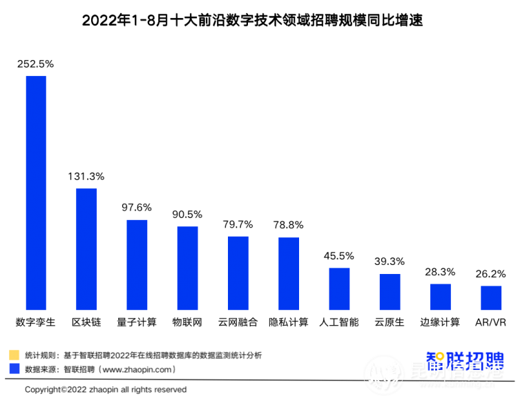 伴随着数字技术的应用落地,相应人才招聘需求也随之涌现。智联招聘数据显示,今年1至8月,十大前沿数字技术中,数字孪生领域技术岗位招聘规模同比增速最高,达252.5%。而区块链以131.3%的招聘需求增速紧随其后。在两大技术招聘需求实现3位数的超速增长外,其余前沿技术的表现也十分亮眼,量子计算、物联网、云网融合、隐私计算,分别以97.6%、90.5%、79.7%、78.8%的同比增速排名TOP 3-TOP 6。此外,发展相对成熟的人工智能招聘规模同比增长45.5%,云原生、边缘计算两项“超前”技术增速分别为39.3%、28.3%。在多领域得到充分应用的AR/VR技术招聘需求,同比增速为26.2%,排在十强之末。