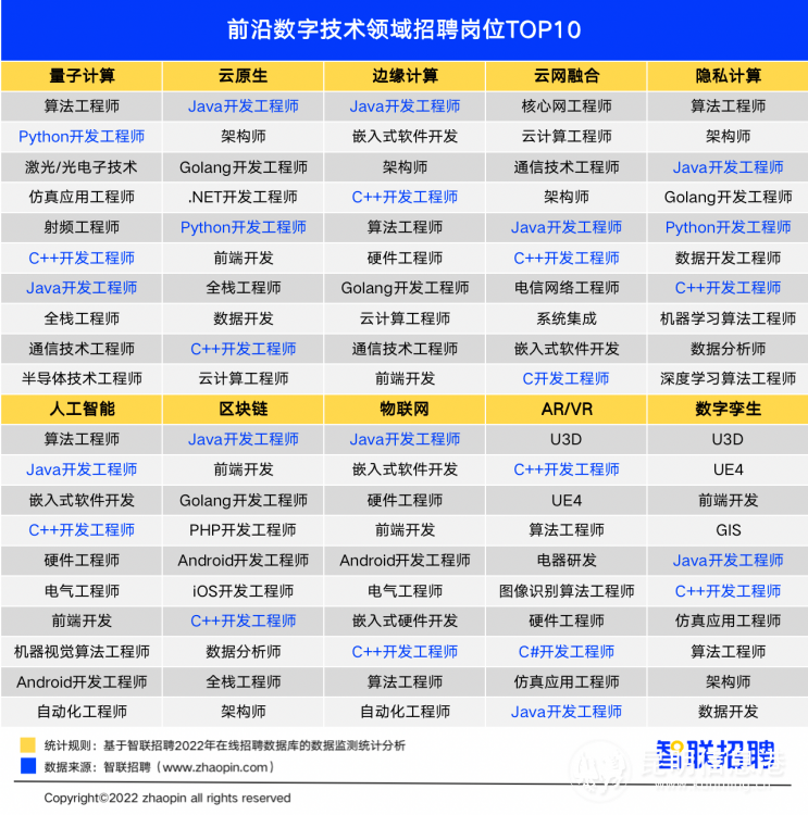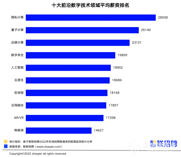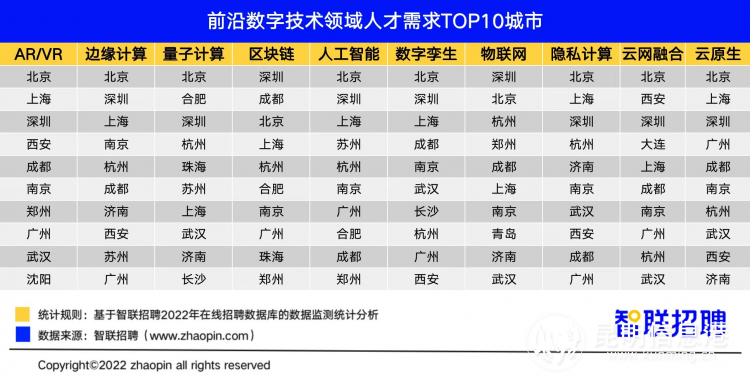 总体来说,随着数字孪生、量子计算等“超前沿”技术从技术概念演变成新的转型路径和变革动力,人才需求增长也呈现出迅猛之势。而人工智能、AR/VR等技术发展及应用时间较久,市场竞争充分、格局相对固定,因此对人才的招聘需求增速相对较低。