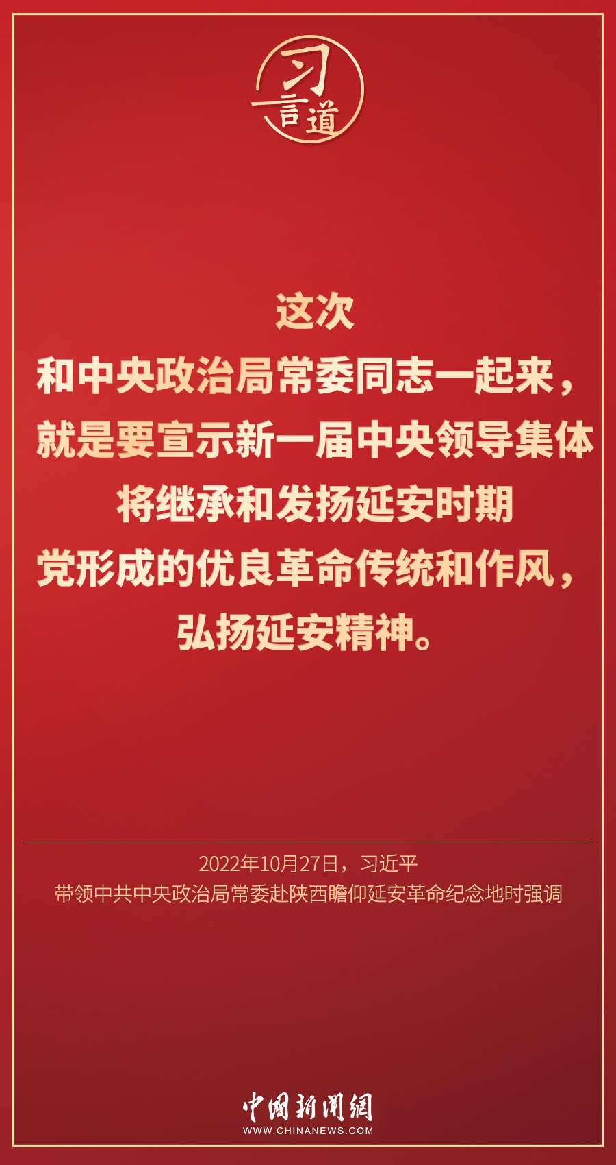党的二十大闭幕不到一周,中共中央总书记、国家主席、中央军委主席习近平带领中共中央政治局常委李强、赵乐际、王沪宁、蔡奇、丁薛祥、李希,专程从北京前往陕西延安,瞻仰延安革命纪念地。此行中,习近平多次谈到延安精神——