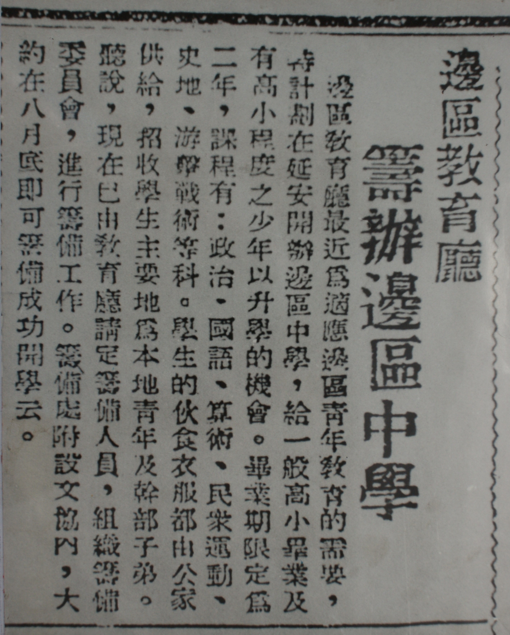 △1938年7月30日,陕甘宁边区政府机关报《新中华报》载文:《边区教育厅筹办边区中学》。(总台央广记者潘毅提供)