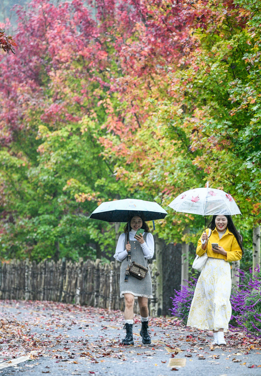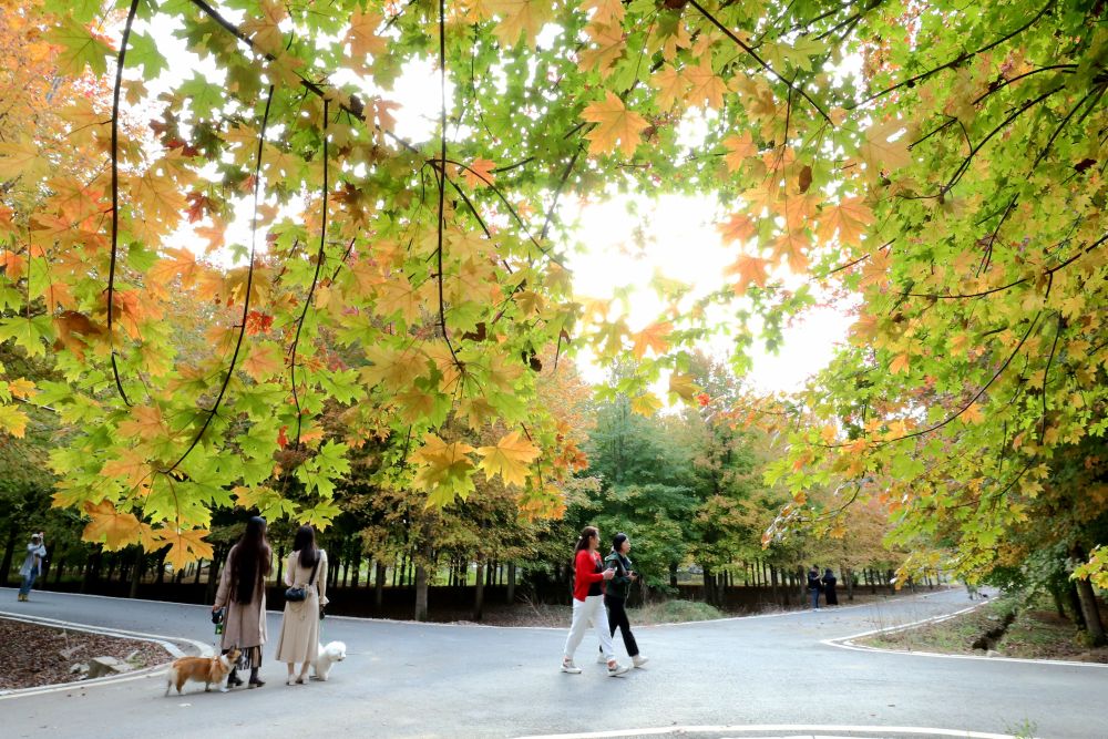 10月21日,游客在山东省青岛市西海岸新区张家楼街道张家楼村枫树林赏景游玩。新华社发(王培珂 摄)