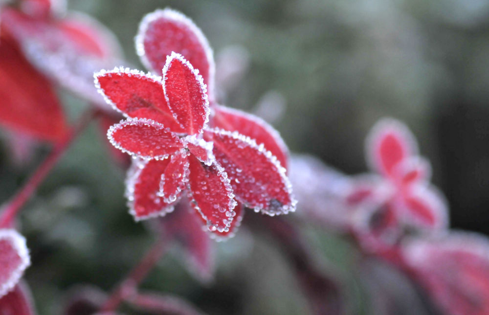 10月16日,在云南省迪庆藏族自治州香格里拉市建塘镇,植物叶子上挂着白霜。新华社发(余富全 摄)