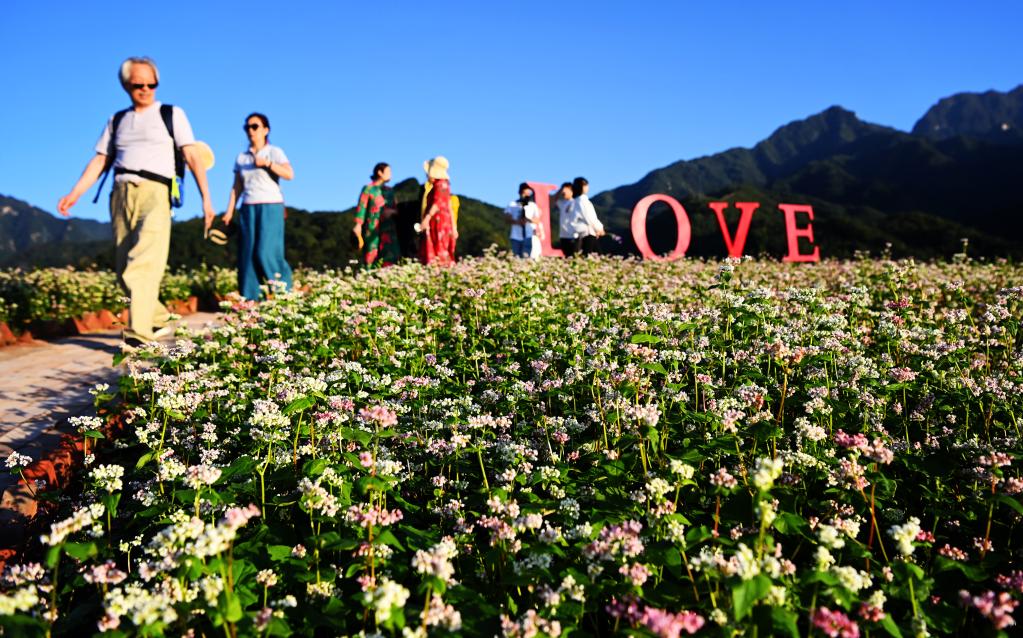 游人在西安市蓝田县九间房镇峪口村荞麦花海农业景区游览。新华社记者 刘潇摄