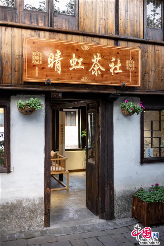 一杯清茶慰秋凉。一半清香,一半醉。湖光软漾,目光游弋,步子跟着流水缓了下来,斜身隐入街角的茶楼,点上一杯“阿婆茶”,这是周庄入秋的仪式。古朴气韵、木香缠绕,声色之间,抿一口茶香,身与心皆泡在这杯江南意境里。正如馆名“晴虹茶社”,一杯茶歇,如晴日彩虹,拂开心中尘雾,只见晴天与好事。聚宾楼里阿婆茶香就着声声悠扬,时间氤氲成过眼云烟。