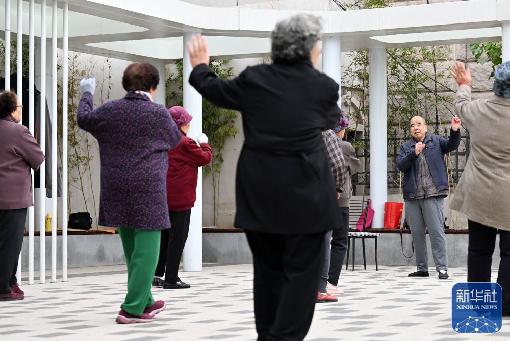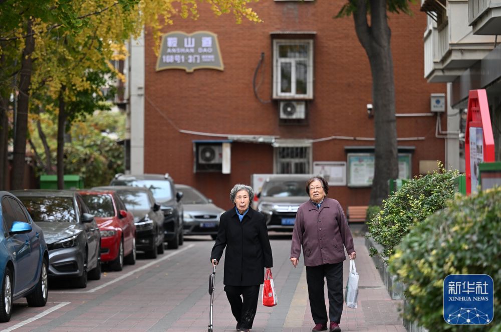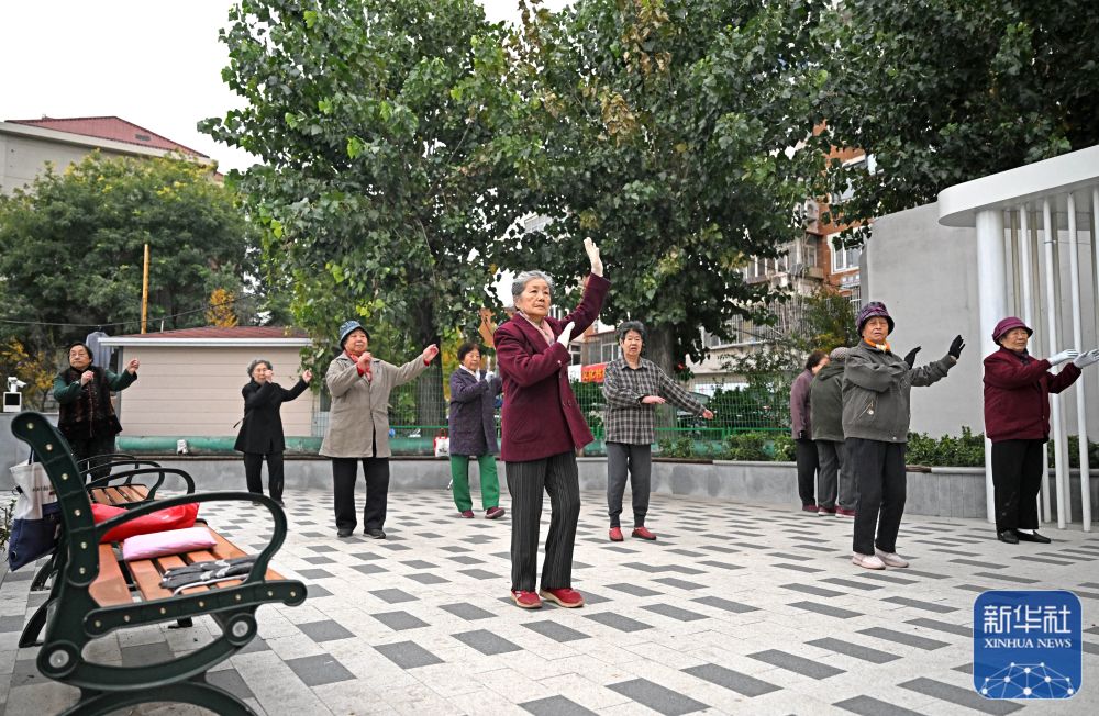 在天津市和平区文化村社区,老年人在适老化改造中新建的小区广场上跳舞(10月28日摄)。