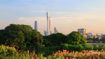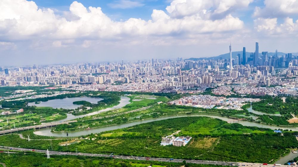 夕照下广州海珠湿地水稻田与不远处璀璨城市天际线相映(2020年7月25日摄)。