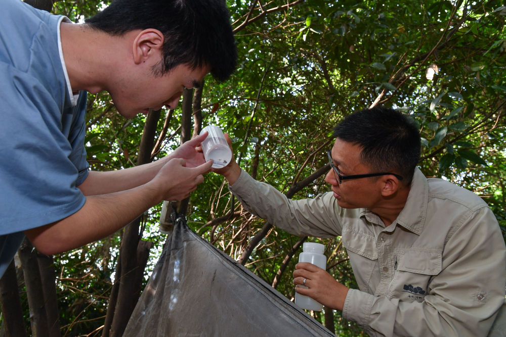 科研人员在广州海珠湿地查看马氏网采集到的昆虫样本(2021年10月25日摄)。