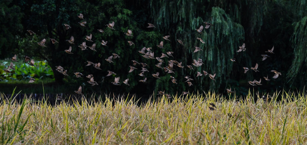 广州海珠湿地稻田里的斑文鸟(2020年7月25日摄)。