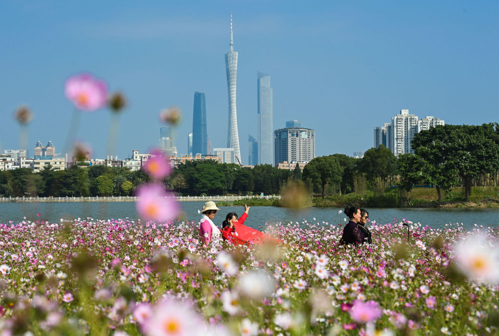 游客徜徉在广州海珠湿地海珠湖畔波斯菊花海之中(2020年11月3日摄)。