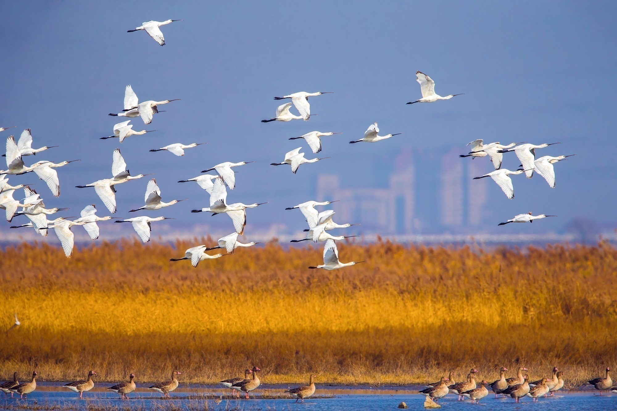 秋日的天津北大港湿地自然保护区,天高云阔,众鸟云集。
