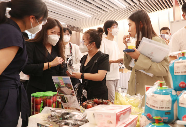 2022年8月30日,第五届进博会食品和医疗展区展前供需对接会嘉宾在参展企业展位前品尝水果。 新华社记者 方喆 摄