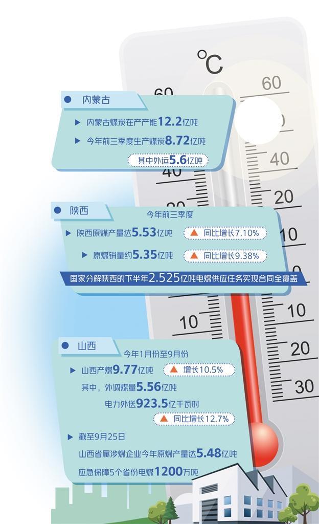 陕西能源生产保持稳定、供应安全可靠。今年前三季度,陕西省原煤产量达5.53亿吨,同比增长7.10%;原煤销量约5.35亿吨,同比增长9.38%。陕西省下半年约3310万吨电煤需求量已足额签订,国家分解陕西的下半年2.525亿吨电煤供应任务实现合同全覆盖。