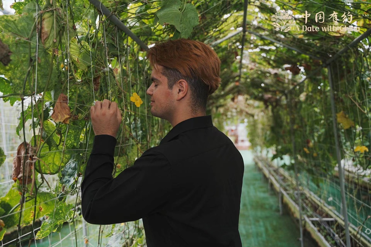 巴西籍清华大学留学生孟泰龙正在参观喜番乐有机生态农场位于雪水港村的种植基地。