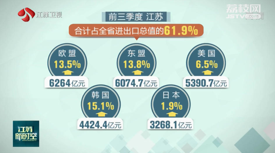 在多项举措的带动下,前三季度,江苏对欧盟、东盟、美国等主要贸易伙伴均实现较大幅度增长。对“一带一路”沿线国家进出口1.09万亿元,增长14.9%。对拉美和非洲进出口增速均快于整体。呈现出主要市场保持增长,新兴市场开拓有力的局面。民营企业进出口1.62万亿元,增长15%,民营企业进出口增长拉动全省进出口增长5.7个百分点,成为外贸增长的最主要拉动力量。