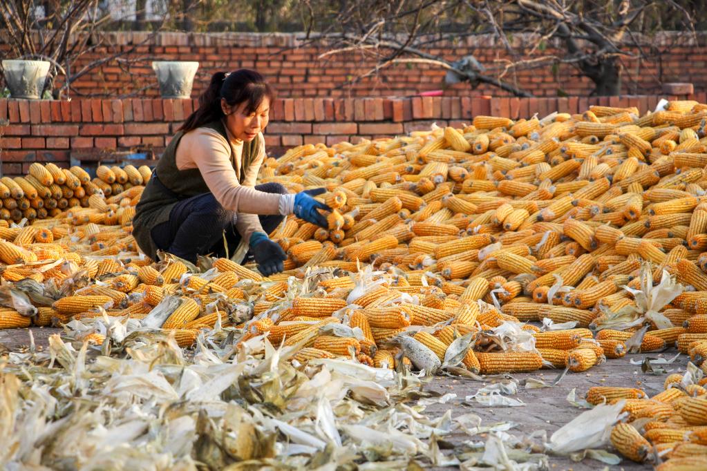 10月29日,在内蒙古通辽市科尔沁左翼中旗花吐古拉镇三家子村,村民刘焕梅在晾晒玉米。新华社记者连振/摄