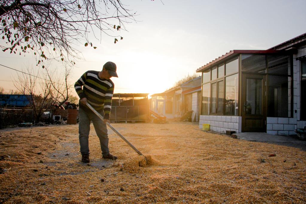 10月29日,在内蒙古通辽市科尔沁左翼中旗花吐古拉镇三家子村,村民杜永吉在晾晒玉米。新华社记者连振/摄