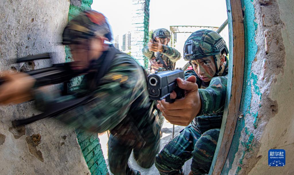 武警广西总队北海支队学习贯彻党的二十大精神,掀起练兵备战热潮,组织特战队员开展综合演练(10月27日摄)。新华社发(梁承杰 摄)