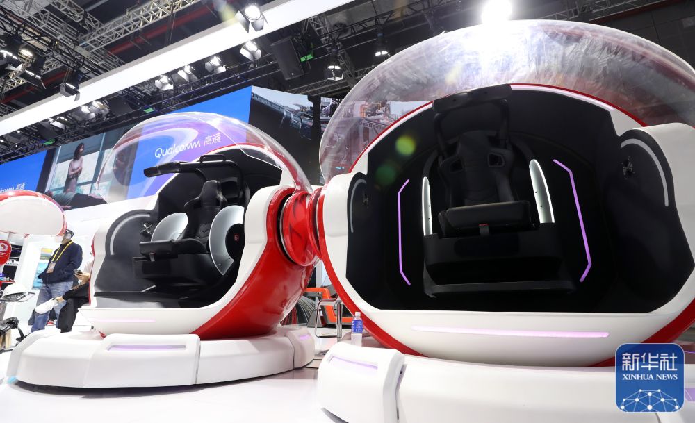 11月2日拍摄的美国高通公司展台上的一组游戏体验仓展品。