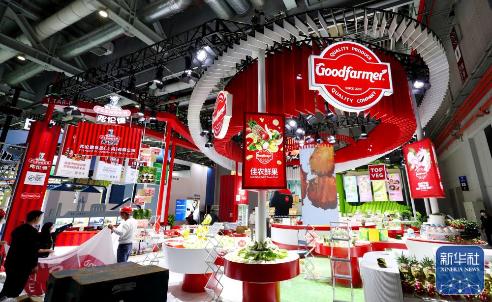 11月2日,工作人员在佳农鲜果进博会展台进行布展工作。