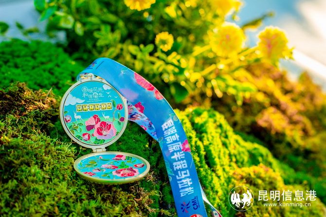 亲子跑完赛奖牌继续沿用“百岁锁”设计, 承载着平安健康、茁壮成长的祝福,奖牌正面绽放着一朵美丽的昆明市花山茶花。