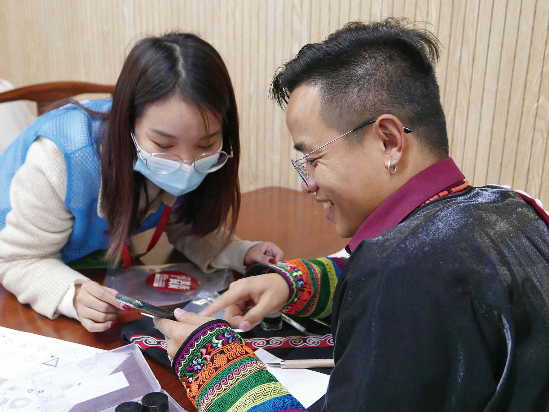 四川吉日坡文化中心的漆器传承人李浩磊在湖北美术馆志愿者的协助下体验大漆艺术
