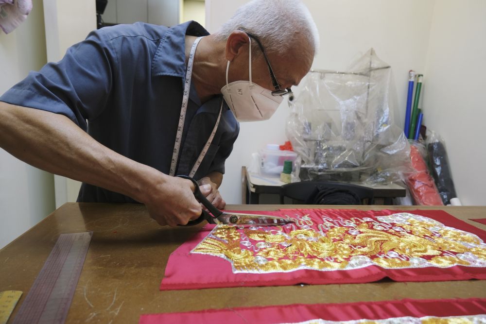 制作裙褂需要经过设计图案、剪裁、刺绣、缝制等数十道工序,全部由手工完成。刘师傅从事制衣这一行当超过50年,问起中式裙褂与西式服装制作上的不同,他笑言,“完全是两个科目”。